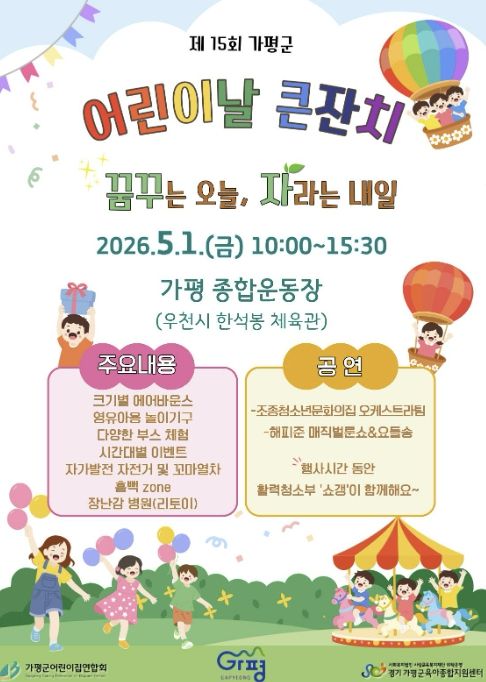 (중부시사신문) 가평군은 오는 5월 1일 오전 10시 가평종합운동장에서 ‘제15회 가평군 어린이날 기념행사’를 개최한다. 가평군어린이집연합회와 가평군육아종합지원센터가 공동 주관하는 이번 축제는 기념행사와 공연, 놀이, 체험 부스 등 다채로운 프로그램으로 꾸며진다.