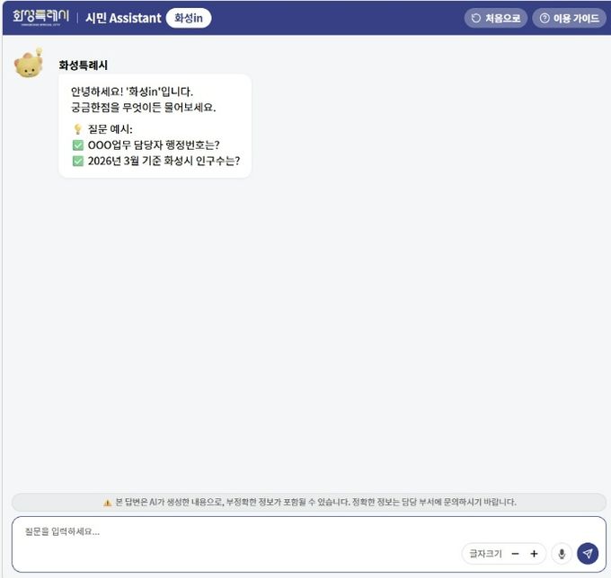 (중부시사신문) 화성특례시는 시민 체감형 행정서비스 강화를 위해 23일부터 ChatGPT 기반 대화형 AI 검색 서비스 ‘화성in’을 정식 운영한다.