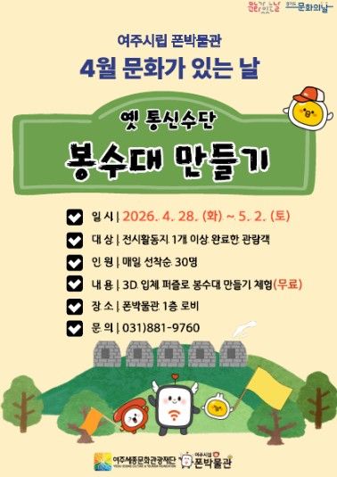 (중부시사신문) 여주세종문화관광재단이 운영하는 여주시립 폰박물관은 4월 '문화가 있는 날'을 맞아 오는 4월 28일부터 5월 2일까지 시민 참여형 체험 행사 '소식을 전하던 봉수대 만들기'를 운영한다.