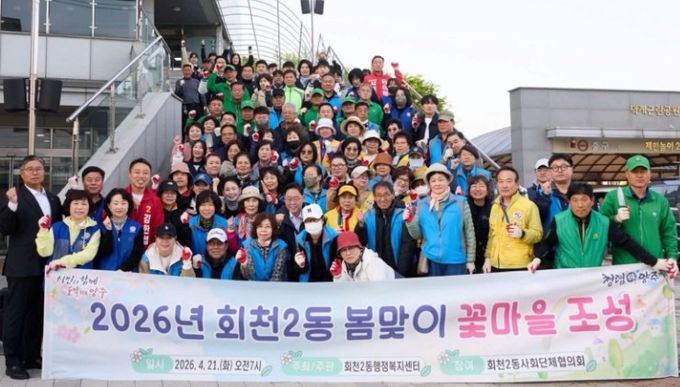 이날 행사에는 회천2동 사회단체 회원과 지역 주민 등 150여 명이 참여했다. 참가자들은 유동 인구가 많은 회천2동 청사 인근과 평화로 일대 화분 설치 구간에 메리골드, 사피니아 등 봄꽃 1만여 본을 식재해 거리 곳곳에 생기를 더했다.