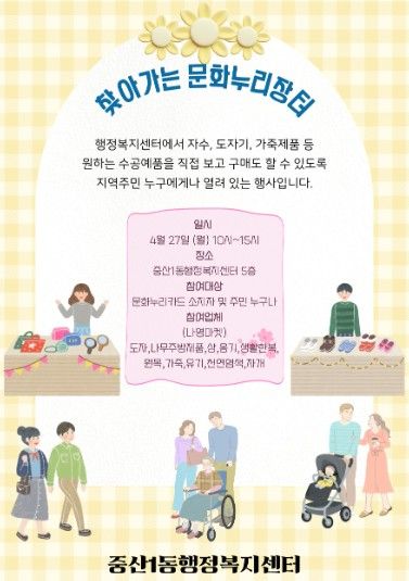 (중부시사신문) 고양특례시 일산동구 중산1동은 오는 4월 27일 오전 10시부터 오후 3시까지 센터 5층 다목적실에서 ‘찾아가는 문화누리장터’를 개최한다.