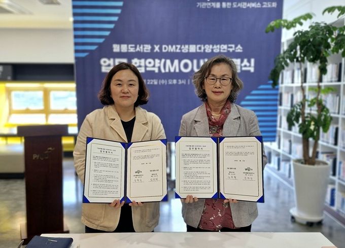 (중부시사신문) 파주시 월롱도서관은 지난 22일 디엠지(DMZ)생물다양성연구소와 지역사회 독서진흥 및 생태환경 분야 협력을 위한 업무협약을 체결했다.