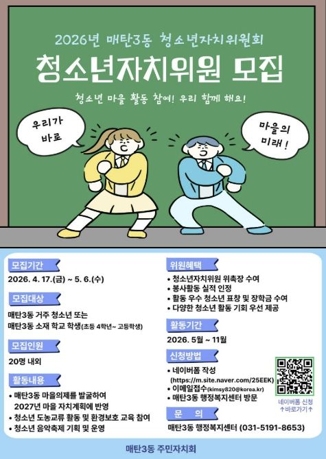 (중부시사신문) 수원시 영통구 매탄3동은 매탄3동 주민자치회가 지역 청소년의 참여를 확대하고, 향후 지역사회를 이끌어 나갈 역량을 기르기 위해 2026년 청소년자치위원회 위원을 모집한다고 밝혔다.