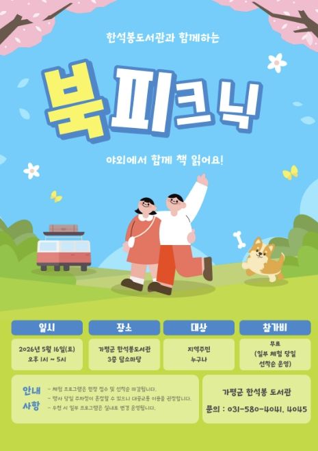나상진 평생교육사업소장은 “이번 행사로 도서관이 정적인 공간을 넘어 책과 어우러지는 활기찬 지역 거점으로 자리 잡기를 기대한다”며 “가족과 함께하는 북 피크닉 행사를 통해 가평군민들이 도서관을 찾아 책과 함께 여유와 휴식을 찾는 계기가 되길 바란다”고 말했다.