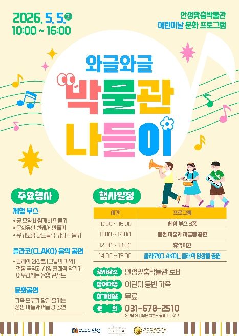 박물관 1층 로비에서는 흥겨운 문화 공연이 이어진다. 오전 11시에는 어린이 관람객의 눈높이에 맞춘 ‘참여형 레크레이션 풍선마술 및 저글링 공연’이 펼쳐져 축제 분위기를 고조시킬 예정이다. 오후 2시에는 중앙대 재학생 및 졸업생으로 구성된 현악 4중주 팀 ‘CLAKO(클라코)’가 출연해 국악과 클래식을 융합한 격조 높은 연주를 선보인다. 특히 CLAKO의 공연은 어린이날을 맞아 지역 문화 활성화를 위해 재능기부 형식으로 진행되어 더욱 뜻깊은 시간이 될 전망이다.