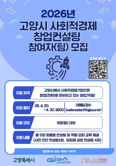 (중부시사신문) 고양산업진흥원이 운영하는 고양시사회적경제지원센터가‘2026년 고양시 사회적경제 창업컨설팅 사업’에 참여할 예비 창업자(팀)을 오는 30일까지 모집한다.