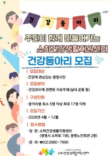(중부시사신문) 광명시 소하건강생활지원센터가 시민 스스로 건강을 관리하고 실천하도록 돕기 위해 오는 12월까지 ‘주민참여형 건강동아리’를 상시 모집한다.