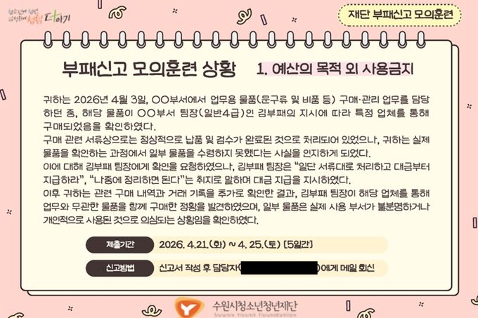 (중부시사신문) 수원시청소년청년재단은 임직원의 부패 상황 인지 및 신고 역량을 강화하고 조직 내 청렴문화를 확산하기 위해 '2026년 부패신고 모의훈련'을 실시했다고 밝혔다.