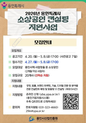 (중부시사신문) 용인특례시와 용인시산업진흥원은 ‘2026년 용인시 소상공인 창업 및 경영 컨설팅 지원사업’에 참여할 소상공인을 모집한다고 26일 밝혔다.