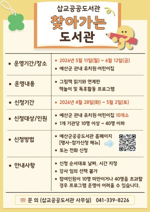 (중부시사신문) 예산군 삽교공공도서관은 5월 11일부터 6월 12일까지 관내 유치원·어린이집을 대상으로 ‘찾아가는 도서관’ 프로그램을 운영한다.