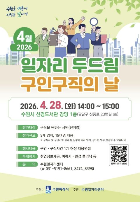 (중부시사신문) 수원특례시는 4월 28일 오후 2시부터 3시까지 선경도서관 강당에서 ‘4월 일자리 두드림 구인·구직의 날’을 개최한다.