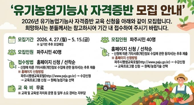 (중부시사신문) 파주시농업기술센터는 친환경농업 분야 농업 전문 인력 육성을 위한 '2026년 유기농업기능사 자격증 취득’교육생을 4월 27일부터 5월 15일까지 모집한다.