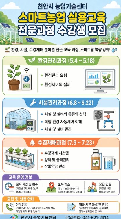 (중부시사신문) 천안시농업기술센터는 5~ 7월 ‘스마트농업 실용교육 전문과정’을 운영한다고 27일 밝혔다.