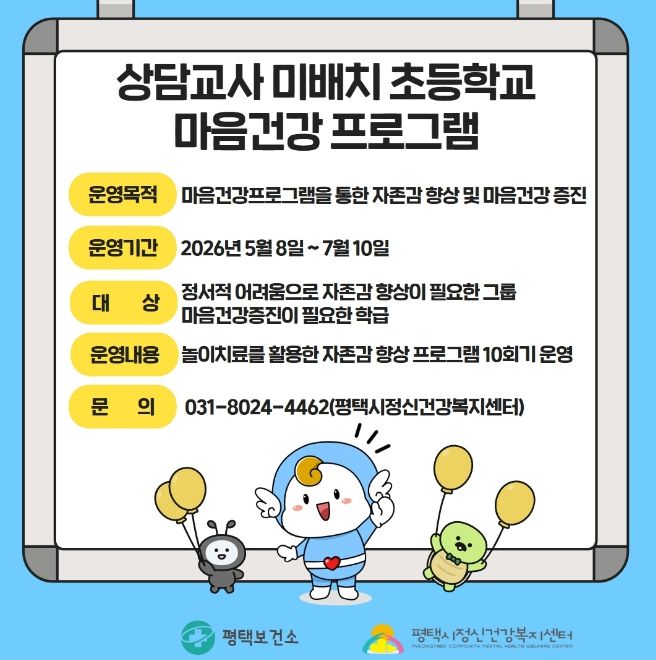 (중부시사신문) 평택시는 상담교사가 배치되지 않은 초등학교 학생들의 정신건강 지원을 위해 ‘마음건강 프로그램’을 운영한다고 밝혔다.