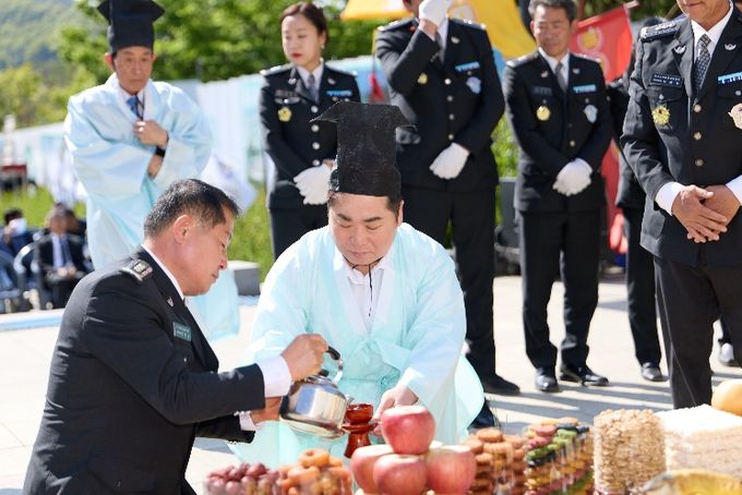 친수식의 하이라이트인 동상 세척 작업에서는 아산시장과 자율방범연합대장이 직접 크레인에 올라 장군의 동상에 쌓인 먼지를 정성스럽게 씻어내는 퍼포먼스를 선보였다. 이어 자율방범대 임원들과 참석자 전원이 함께하며 장군의 정신을 다시 한번 가슴에 새겼다.