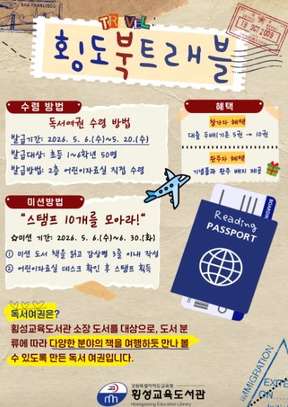 (중부시사신문) 횡성교육도서관은 5월 6일부터 6월 30일까지 어린이들의 자발적인 독서 습관 형성과 도서관 이용 활성화를 위해 독서 여권을 활용한 ‘횡도북트래블’ 프로그램을 운영한다고 밝혔다.