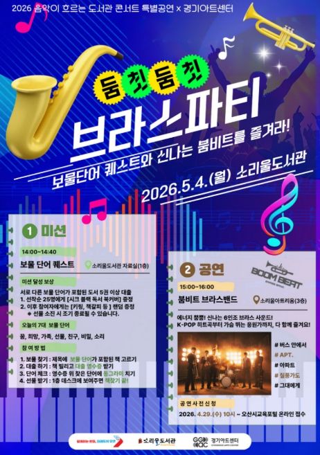 (중부시사신문) 오산시 소리울도서관은 제104회 어린이날을 앞둔 오는 5월 4일 경기아트센터와 협업해 ‘2026 음악이 흐르는 도서관 콘서트’ 특별공연인 ‘둠칫둠칫 브라스 파티’를 개최한다고 밝혔다.
