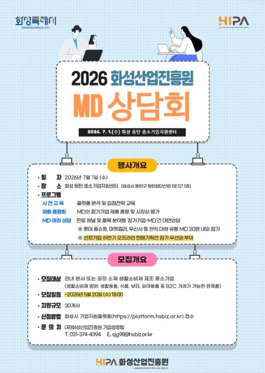(중부시사신문) 화성산업진흥원(원장 전병선)은 화성시 생활소비재 기업의 대형 유통망 진입과 신규 판매채널 확보를 지원하기 위해 ‘2026년 화성산업진흥원 MD 상담회’를 개최하고, 오는 5월 20일까지 참여기업을 모집한다.