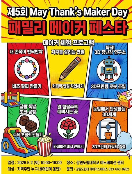 (중부시사신문) 강원도립대학교는 5월 가정의 달을 맞아 가족 참여형 체험 행사인 ‘패밀리 메이커 페스타’를 오는 5월 2일 교내 이노베이션센터에서 개최한다.