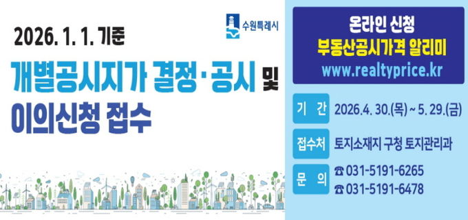 (중부시사신문) 수원시 권선구는 4월 30일 결정·공시되는 개별공시지가에 대해 4월 30일부터 5월 29일까지 이의신청을 접수한다고 밝혔다.