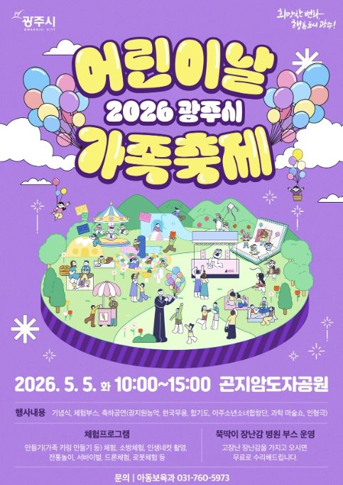 시 관계자는 “어린이날 가족축제가 아이들에게 꿈과 희망을 키우는 특별한 하루가 되고 가족 모두에게 소중한 추억이 되길 바란다”며 “앞으로도 어린이들이 건강하고 행복하게 성장할 수 있는 환경을 조성해 아동친화도시 광주시를 만들어 나가겠다”고 말했다.