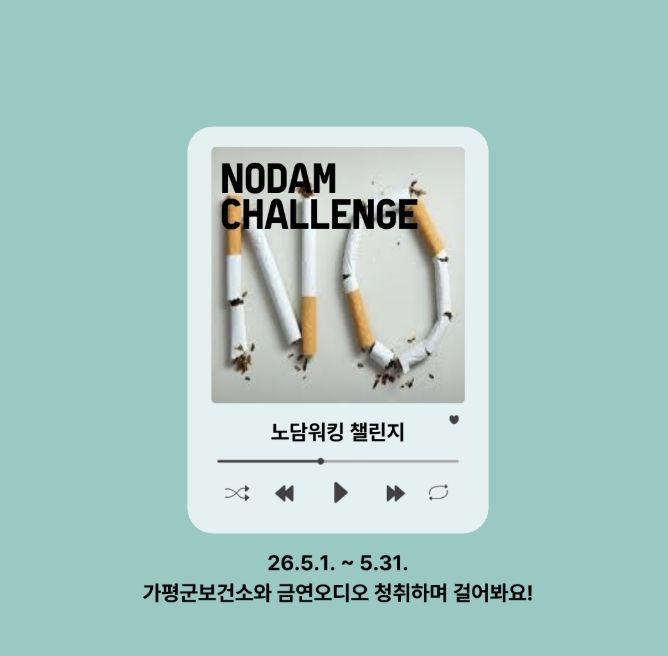 (중부시사신문) 가평군보건소가 ‘세계 금연의 날’을 앞두고 5월 1일부터 한 달간 금연 인식 확산을 위한 ‘노담워킹 챌린지’를 진행한다. 이번 행사는 일상 속 걷기 실천과 금연 홍보를 병행해 군민들의 건강한 생활 습관 형성을 돕고자 마련됐다.