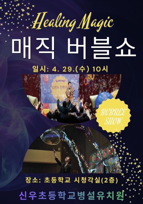 (중부시사신문) 신우초등학교병설유치원은 4월 29일 교내 시청각실에서 ‘힐링 매직버블쇼’ 공연을 개최했다고 밝혔다. 이번 공연은 유아들이 직접 참여하며 즐길 수 있는 체험형 프로그램으로 마련됐다.
