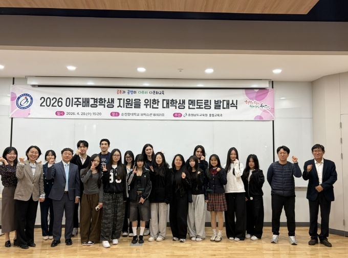 (중부시사신문) 충남교육청은 29일, 순천향대학교(아산)에서 순천향대 지도자 학생 6명과 온양용화고·아산충무고 학생 20명, 담당 교사 등 30여 명이 참석한 가운데 ‘2026 이주배경학생 지원을 위한 대학생 지도 발대식’을 개최했다.