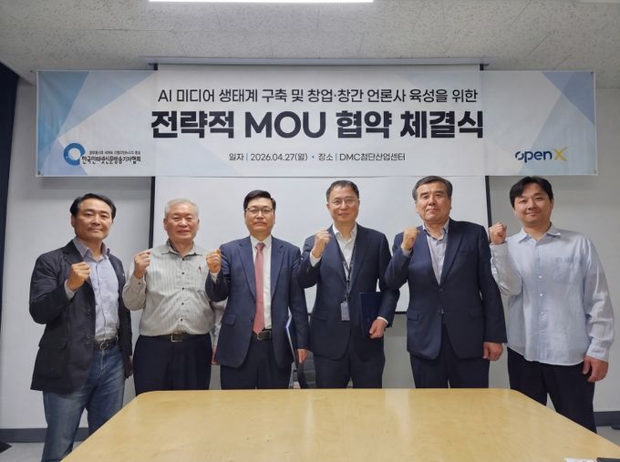(중부시사신문) 한국인터넷신문방송기자협회(회장 전병길, 이하 협회)와 오픈엑스(대표 김미진)는 지난 2026년 4월 27일 서울 상암동 DMC첨단산업센터에서 업무협약(MOU)을 체결하고, 제휴 언론사 육성과 건강한 미디어 생태계 강화를 위해 적극 협력하기로 뜻을 모았다.