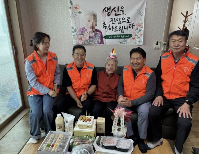 이날 강연식 단장, 김윤태 부단장, 김경일 동장 및 직원들이 함께 방문해 협약기관인 아산시사회적기업협의회에서 후원받은 케이크·떡·밑반찬 등 10종과 행복키움 후원금으로 마련한 생신 선물, 온양5동 청년회가 후원한 축하화분으로 생신상을 차렸다.