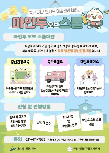 (중부시사신문) 안산시 정신건강복지센터는 11월까지 관내 초·중·고등학교 총 10개교를 대상으로 학교로 찾아가는 정신건강사업 ‘마인두 오브 스쿨’을 운영한다고 30일 밝혔다.
