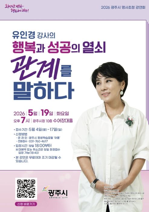 명사 초청 강연회는 광주시민 누구나 참여할 수 있으며, 5월 4일부터 5월 17일까지 광주시 평생학습포털 ‘어흥’과 전화 접수를 통해 사전 신청을 받는다. 강연 당일 입장은 오후 6시부터 가능하며 미예약 또는 취소로 발생한 남은 좌석은 오후 6시 40분부터 현장 선착순으로 입장할 수 있다.