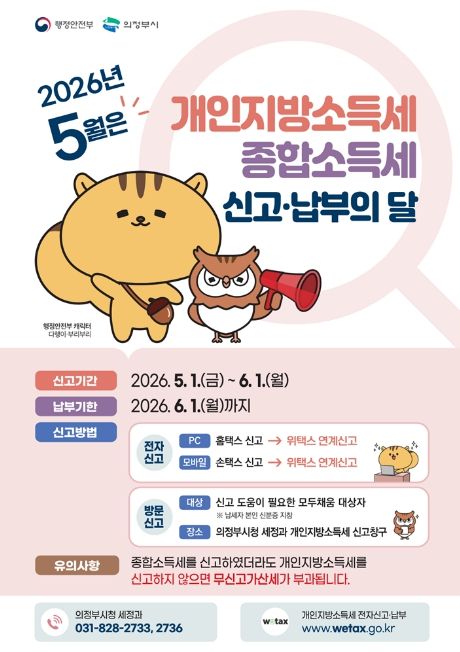(중부시사신문) 의정부시는 5월 개인지방소득세 및 종합소득세 확정신고 기간을 맞아, 5월 6일부터 6월 1일까지 시청 본관 세무민원실에 신고 도움창구를 운영한다.