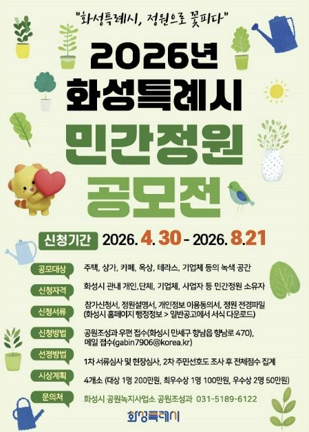 (중부시사신문) 화성특례시가 ‘정원으로 꽃피는 화성’을 만들기 위해 관내의 아름답고 가치 있는 민간정원을 발굴하는 ‘2026년 화성특례시 민간정원 공모전’을 개최한다.