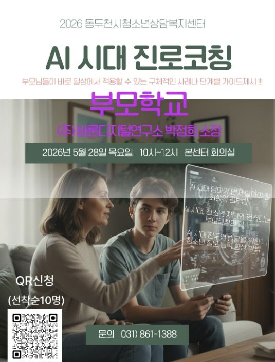주요 내용은 ▲AI 및 미래 사회 변화 이해 교육 ▲청소년 발달 및 심리 특성 교육 ▲부모-자녀 소통 캠프 ▲자연·체험 중심 정서 회복 프로그램 등으로 구성된다. 특히 동두천 놀자숲과 동두천미디어센터 등 지역 자원을 활용한 체험 활동을 통해 가족 간 긍정적 상호작용을 강화할 예정이다.