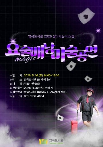 (중부시사신문) 김포시 양곡도서관은 오는 5월 16일 오후 2시부터 3시까지 가족이 함께 즐길 수 있는 ‘요술배낭 마술 공연’을 운영한다. 이번 공연은 김포문화재단의 ‘2026 찾아가는 버스킹’ 사업으로 진행되는 프로그램이다.