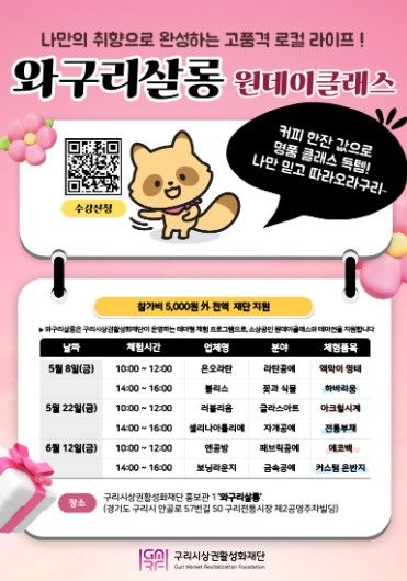 와구리살롱은 관내 소상공인의 제품과 서비스를 의(衣)·식(食)·주(住) 세 가지 주제로 풀어낸 체험형 홍보 프로그램으로, 소상공인이 직접 강사로 참여하는 일일 강좌와 테마전으로 구성된다.