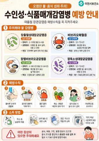 이천시 보건소 관계자는 “하절기에는 기온 상승으로 음식물 부패가 쉬워지고, 야외활동과 단체생활이 늘어나 수인성·식품매개 감염병 발생 위험이 높아질 수 있다”라며, “시민 여러분께서는 손 씻기, 음식 익혀 먹기, 물 끓여 마시기, 조리기구 위생관리 등 개인위생 수칙을 철저히 지켜주시기 바란다”라고 당부했다.