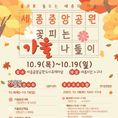 (중부시사신문) 가을의 정취가 절정에 달하는 10월, 세종중앙공원에서 꽃과 문화가 어우러진 축제가 열린다. 세종특별자치시시설관리공단은 오는 10월 9일부터 19일까지 세종중앙공원 도시축제마당 일원에서 ‘세종중앙공원 꽃피는 가을 나들이’ 행사를 개최한다고 밝혔다. 세종시에는 지금까지 봄·여름철 꽃 축제는 있었지만, 가을을 대표하는 꽃 축제는 활성화되지 못했다. 이에 공단은 도심 속에서도 가을의 정취를 만끽할 수 있도록 이번 행사를 기획했다. ‘꽃으로 물드는 세종의 가을’을 주제로 열리는 이번 행사는 시민에게 풍성한 여가와 체험의 기회를 제공하고, 지역 농가와 예술인 참여를 통해 지역경제 활성화에도 기여할 전망이다. ▲ 가을빛 정원으로 물드는 중앙공원 가장 먼저 눈길을 끄는 것은 ‘가을꽃 전시회(10.9.~19.)’ 이다. 세종한글축제와 연계해 중앙공원 방문자센터 일원에 마련된 전시장에는 국화와 계절 초화류, 조경수를 활용한 테마형 정원 ‘가을빛 정원’이 조성된다. 단순히 꽃을 감상하는 데서 그치지 않고, 시민이 직접 참여할 수 있는 포토존이 운영되며