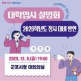 (중부시사신문) 군포시는 오는 12월 5일(금) 오후 7시, 군포시청 2층 대회의실에서 “2026학년도 정시 대비 지원 전략 설명회”를 개최한다. 이번 설명회는 2026학년도 정시 지원을 희망하는 수험생과 학부모에게 실질적인 도움을 주기 위해 경기도교육청 대입진학지도리더교사인 채무철 분당아람고 교사가 초청 강사로 나서 정시 지원 대비 전략을 상세히 안내할 예정이다. 설명회에서는 ▲2026학년도 대입 정시 기본사항 ▲대학수학능력시험 분석 ▲정시 지원 전략 수립 방법 ▲주요 대학별 전형 분석 등 수험생들이 꼭 알아야 할 핵심 정보를 다룬다. 참석을 희망하는 군포시 학생 및 학부모는 11월 19일 오전 9시부터 11월 28일 오후 6시까지 군포시청 홈페이지 ‘시민참여 ' 통합예약 ' 행사/모집’ 코너를 통해 무료로 신청할 수 있다. 이번 입시설명회는 선착순 200명까지 참여 가능하며, 온라인 신청자에게는 설명회 자료집이 제공될 예정이다. 군포시 관계자는 “전년 대비 10% 증가한 재학생 수에 N수생, 검정고시 출신까지 더해져 역대급 규모의 입시 경쟁이 예상되는 2026년 정시 입시를 준비하는