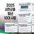 (중부시사신문) 서천군이 금년도 추진한 각종 사업 가운데 우수한 성과를 내면서 서천군을 널리 알린 2025년 서천군을 빛낸 10대 사업을 선정했다. 올해 외부평가 우수 및 기관표창 수상, 공모 사업 선정 등 눈에 띄는 실적을 보인 24건의 시책을 대상으로 공정한 심사를 거쳐 최종 10개 사업을 확정했다. 경제·산업분야에서는 ▲‘전국 최초 2년 연속’어촌신활력 증진사업 공모 선정(600억원 확보) ▲세계자연유산 서천갯벌의 지속가능한 보전과 생태가치 실현(430억원 확보) ▲사계절 해양레저관광 거점으로 도약 춘장대해수욕장 전국 우수해수욕장 선정 ▲투자 르네상스 서해연구소 시범사업 대상지 선정과 전례 없는 투자유치 사업 등을 통해 서해안권 미래 성장 동력 확보에 기여한 사업들이다. 안전·보건분야에서는 ▲충남 도내 유일 2년 연속 풍수해생활권 종합정비사업 선정(874억 확보) ▲서천군보건소, 보건복지부 우수기관 2연속 4관왕 달성 ▲장항 상습 침수 해결을 위한 하수도정비 중점관리지역 지정(647억 확보)이 포함됐다. 행정·복지분야에서는 ▲전국 최우수 노인복지 행정 역량 입증, 노인 복지 분야 최우수 지자체