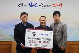 (중부시사신문) (주)에스비일렉트릭이 김천상무에 4년 연속 후원을 이어간다. 김천상무프로축구단(대표이사 이재하)이 3월 12일, 김천시청에서 (주)에스비일렉트릭의 후원금 전달식을 진행했다. 행사에는 에스비일렉트릭 김대견 대표이사, 삼백태양광 김학조 대표이사와 김천상무 이재하 대표이사가 참석했다. 에스비일렉트릭은 2014년 2월 설립한 태양광 발전소 건설 및 기자재 공급 전문 기업이다. 태양광 발전소 인허가, 설계, 시공 및 건축, 발전사업 등을 주요 사업으로 한다. ‘고객의 신뢰를 행동으로 실천하는 기업’이라는 모토아래 설립 이후 매년 눈부신 성장을 이룩했고, 특히, 2025년에는 베트남 호치민에 태양광발전소 솔라닥터패치를 설치하며, 글로벌 기업으로 발돋움했다. 에스비일렉트릭은 김천시 어모면 소재에 공장을 두었으며, ‘지역 스포츠 발전’을 위해 2023년부터 김천상무와 맺은 인연을 올해도 이어간다. 에스비일렉트릭 김대견 대표이사는 “김천과 시민의 자랑인 김천상무를 응원하는 마음으로 후원을 이어가기로 했다. 2년 연속 K리그1 3위라는 좋은 성적을 달성한 만큼 올해도 좋은 모습을 보여주기를 응원한다.