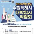 (중부시사신문) 수원시청소년청년재단청소년희망등대는 2026학년도 대입을 준비하는 수험생과 학부모를 위해 오는 12월 13일 수원청소년문화센터에서 ‘수원특례시 2026학년도 대학입시박람회’를 개최한다. 박람회는 이날 오후 1시부터 5시 40분까지 진행된다. 이번 정시전형 박람회에서는 ▴개별 맞춤형 1:1 입시 컨설팅 ▴2026학년도 수능 성적 분석 및 지원전략을 다루는 입시특강 등 실질적 정보를 제공하는 프로그램이 진행될 예정이다. 1:1 진학 컨설팅은 총 120명을 대상으로 진행되며, 11월 25일 오전 9시부터 홈페이지 선착순 접수로 운영된다. 참가자는 수능 성적표와 학교생활기록부 등 관련 자료를 지참해야 한다. 입시전략 특강은 오후 2시부터 3시 30분까지 열리며, 입시 전문가 최승후 선생님이 녪학년도 수능성적 분석 및 정시지원전략-정시지원 가능점수 분석’을 주제로 강연한다. 특강은 100명 선착순 접수로 운영되며, 수험생뿐 아니라 학부모도 참여할 수 있다. 수원시청소년청년재단 최종진 이사장은 “수험생과 학부모가 정확한 정보를 바탕으로 전략적으로 대입을 준비할 수 있도록 이번 박람회를 준비했다”