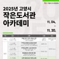 (중부시사신문) 고양특례시는 관내 공·사립 작은도서관 운영자와 자원봉사자의 역량 강화를 위해 오는 11월 4일부터 20일까지 총 7회에 걸쳐‘2025년 작은도서관 아카데미’를 운영한다고 밝혔다. 이번 아카데미는 작은도서관 운영에 필요한 실무 능력을 체계적으로 높이기 위해 마련된 맞춤형 교육 과정이다. 신규 운영자에게는 자료 관리의 기초부터 기본 업무를, 기존 운영자에게는 홍보, 기획, 북큐레이션, 팝업북 제작 등 현장에서 바로 활용할 수 있는 실용적 내용을 제공한다. 교육은 화정도서관 및 덕이도서관에서 대면으로 진행되며, 일부 과정은 온라인(ZOOM) 병행으로 운영된다. 주요 강의 내용은 △자료 관리 기초와 코라시스넷 실습 △생성형 인공지능(AI)을 활용한 작은도서관 홍보 △수서 및 장서 구성 △북큐레이션과 연계 프로그램 운영 △시민 환대의 공간으로서 작은도서관 △폐기 그림책을 활용한 팝업북 만들기 △3D프린터로 작은도서관 토퍼 제작 등이다. 도서관센터 관계자는 “작은도서관은 책 읽는 공간을 넘어, 주민이 모이고 배우는 일상 속 사랑방 역할을 하고 있다”며 “이번 아카데미를 통해 운영자들이 도서관의