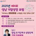 (중부시사신문) 성남산업진흥원은 '2026년 스케일업 지원 정책'을 주제로 오는 12월 11일 11시 30분부터 2025년 제4회 '성남기업성장포럼'을 개최한다. ‘성남기업성장포럼’은 2024년 9월 첫 포럼 개최 이후, 매회마다 참석자가 증가하여, 지난 10월 제3회 포럼에는 170여명의 기업 임직원과 10여개 기업지원기관이 참여하는 등 성남시 기업 성장을 위한 대표 네트워크로 성장하고 있다. 성남시 소재 기업 임직원은 누구나 포럼 참석이 가능하며, 성남산업진흥원 홈페이지를 통해 참석 신청을 할 수 있다. 이번 포럼에서는 '기업지원 미니설명회'에서 시니어 오너 기업의 엑시트(Exit) 전략에 대한 법무법인 지평의 발표에 이어 창업진흥원과 중소기업기술정보진흥원이 2026년 스케일업 지원방향과 주요 사업을 소개한다. 김윤정 창업진흥원 혁신사업화본부 본부장은 창업 초기단계와 성장단계 기업에 대한 내년도 지원 내용을 설명하고, 차인호 중소기업기술정보진흥원 사업총괄관리실 책임연구원은 중소기업 기술혁신(R&D)을 위한 주요 사업을 안내한다. 또한 성남시 소재 2개사가 자사의 기술과 비즈니스 모델