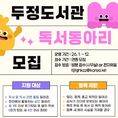 (중부시사신문) 천안시 두정도서관은 책 읽는 공동체 형성을 위해 독서동아리를 모집한다고 30일 밝혔다. 모집 대상은 독서를 비롯해 토론, 필사, 글쓰기 등을 하는 성인 동아리로, 매월 1회 이상 정기모임을 갖는 4인 이상의 독서동아리다. 독서동아리로 선정되면 활동 장소 제공 및 동아리 홍보, 독서문화프로그램 우선 접수권 부여 등을 지원한다. 참여 신청은 두정도서관에 방문하거나 전자메일로 제출하면 된다. 자세한 내용은 천안시도서관 누리집에서 확인할 수 있다. 두정도서관 관계자는 “지역 주민이 독서동아리를 통해 책을 매개로 타인과 소통하고, 함께 읽는 즐거움을 경험할 수 있기를 바란다”고 말했다.