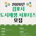 (중부시사신문) 김포시는 다양한 도시재생사업을 홍보하고 도시재생에 대한 시민들의 이해와 관심을 도모하고자 오는 12일부터 ‘2026년 김포시 도시재생 서포터즈’를 모집한다. 모집 기간은 3월 6일 17시까지이며, 도시재생에 관심이 있고 홍보 콘텐츠 기획 및 SNS 활용이 가능한 김포시 시민이라면 누구나 지원이 가능하다. 도시재생 서포터즈는 6명 내외로 선발되며, △김포시 도시재생사업 취재 및 기사 작성 △도시재생 활동 참여 및 수기작성 △아이디어 기획회의 등의 활동을 하게 된다. 합격자 발표는 3월 12일이며 선발된 서포터즈에게는 위촉장 수여, 기사 및 콘텐츠 작성 건에 대한 소정의 활동비 등 다양한 혜택이 제공된다. 시 관계자는 “도시재생 서포터즈의 활발한 활동을 통해 도시재생사업에 대한 시민들의 이해와 참여가 높아지길 바란다”고 말했다. 자세한 내용은 김포시 홈페이지 고시공고 또는 김포시도시재생지원센터 블로그에서 확인할 수 있다.