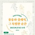 (중부시사신문) 의정부음악도서관은 9월 27일 오후 3시 3층 뮤직홀에서 의정부국악협회의 ‘풍류와 클래식, 그 특별한 순간’ 공연을 개최한다. 이번 공연은 국악의 아름다움과 서양 클래식의 감성을 융합해 시민들에게 새로운 음악적 감동을 선사하고자 기획했다. 친숙한 공간인 음악도서관을 무대로 삼아, 수준 높은 공연을 일상 가까이에서 즐길 수 있도록 준비했다. 의정부국악협회 소속 지역 음악인들이 민요, 가야금병창, 태평소 연주 등 다채로운 국악 공연을 선보인다. 특히, 기존 국악공연의 형식을 넘어서는 서양 클래식 협연으로 관객들에게 새로운 감흥을 전할 예정이다. 전통음악 특유의 깊이 있는 울림에 클래식의 세련된 선율이 더해져 공연장을 독창적인 하모니로 물들일 것으로 기대된다. 음악도서관 관계자는 “앞으로도 시민들이 전통과 현대가 어우러진 무대를 함께 즐기며, 지역 문화예술을 생활 속에서 더욱 쉽게 접하길 바란다”고 말했다.
