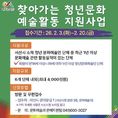 (중부시사신문) 충남 서산시는 청년 문화예술 활성화를 위해 오는 2월 20일까지 ‘2026년 찾아가는 청년문화 예술활동 지원사업’ 참여단체 6팀을 모집한다고 밝혔다. 이번 지원사업은 지역 청년 문화예술인의 문화예술 참여기회를 확대하고 역량을 강화하기 위해 추진된다. 지원 대상은 서산시에서 활동하는 청년 문화예술인 단체이며 18세 이상 39세 이하인 회원이 5인 이상인 단체다. 사업 추진을 희망하는 단체는 최근 1년 이상 문화예술 관련 활동 실적이 있어야 하며, 동일 사업으로 국가나 다른 지자체·공공단체 등에서 지원금을 받는 경우 선정 대상에서 제외된다. 지원 분야는 연극·음악·무용·전통예술 등 공연 부문과 지역 주민을 대상으로 한 문화예술 교육프로그램 기획 부문이다. 신청은 서산시청 문화예술과에 방문 또는 우편 접수로 가능하며, 자세한 사항은 서산시 누리집에 게시된 공고문을 통해 확인할 수 있다. 시는 부서심사와 지방보조금관리위원회 심의를 거쳐 참여단체를 선정한 뒤 3월 중 개별 통보할 예정이며, 선정 단체에는 최대 400만 원을 지원할 방침이다.
