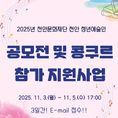 (중부시사신문) 천안문화재단은 내달 3~ 5일까지 ‘천안 청년예술인 공모전 및 콩쿠르 참가 지원사업’ 참여자를 모집한다고 15일 밝혔다. 재단은 청년예술인의 문화예술 활동 영역을 확장하고 지원하기 위해 올해부터 공모전과 콩쿠르 참가 활동비 지원사업을 추진하게 됐다. 지원 대상은 천안시에 거주하거나 천안시 소재의 대학교 예술학과 재학 또는 졸업한 만 19세 이상 만 39세 이하의 청년예술인으로, 3년 이상 예술활동 실적이 있으면 신청할 수 있다. 신청은 재단 누리집에서 신청서를 내려받아 작성 후 증빙 서류와 함께 전자우편으로 제출하면 된다. 선정 결과는 심의를 거쳐 내달 19일 재단 누리집에 공지할 예정이다. 자세한 사항은 재단 누리집을 참고하거나 전화로 문의하면 된다.